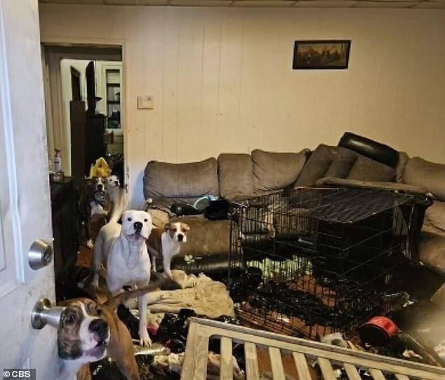 Όταν έφτασαν, βρήκαν το σπίτι σε «άθλια κατάσταση», γεμάτο με περιττώματα σκύλου, σκουπίδια και ούρα. Πλάνα από το εσωτερικό του σπιτιού δείχνουν ένα μεγάλο κλουβί σκύλου στο σαλόνι με κουβέρτες και σκουπίδια γύρω του.