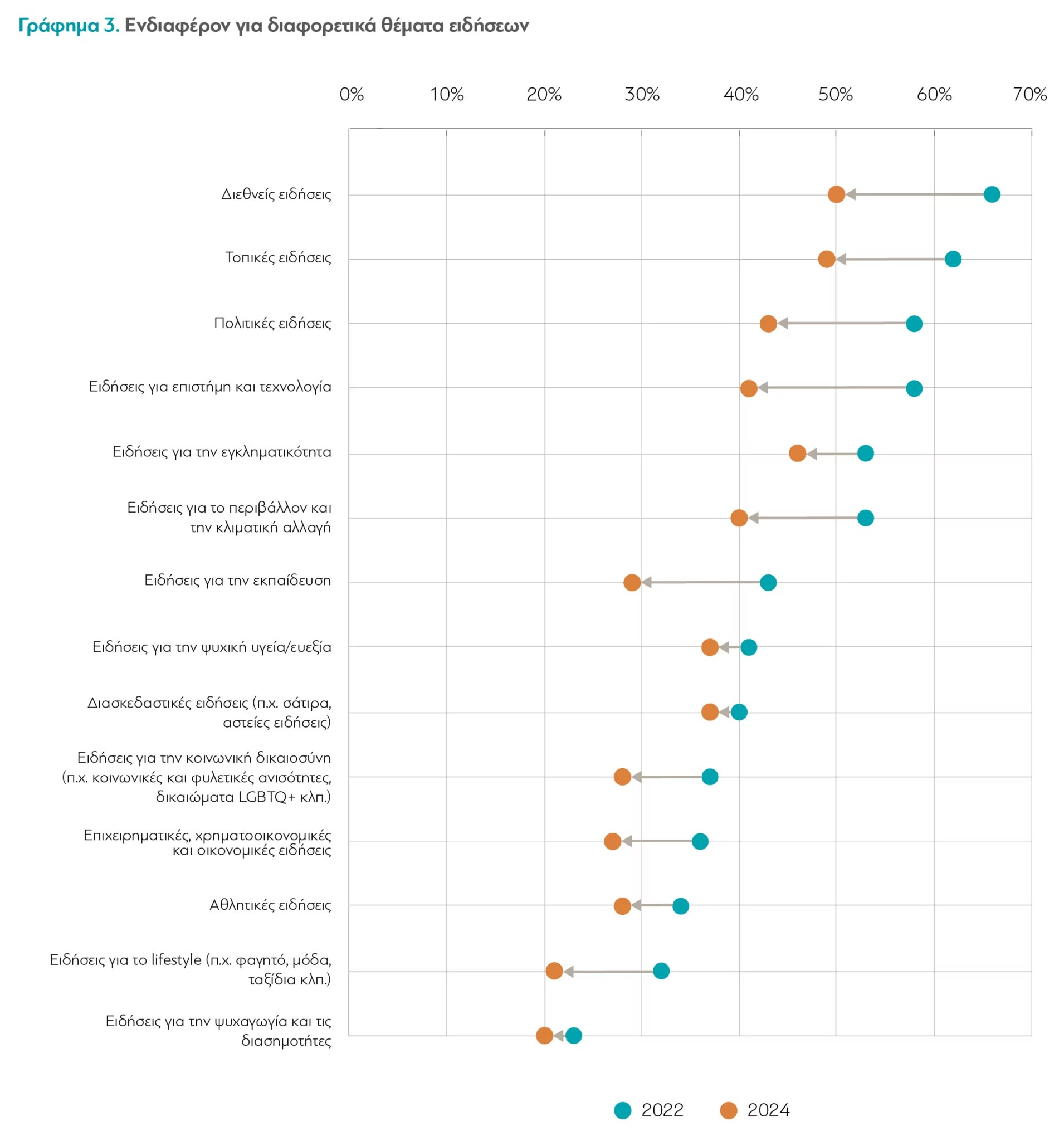 Ως και στις ειδήσεις lifestyle η αποστροφή διαμορφώθηκε στο 79% το 2024 από 68% που ήταν το 2022. Ακόμα και για την ειδησεογραφία για την κλιματική αλλαγή η αδιαφορία διαμορφώθηκε στο 53% όταν δύο χρόνια πίσω ήταν στο 40%.